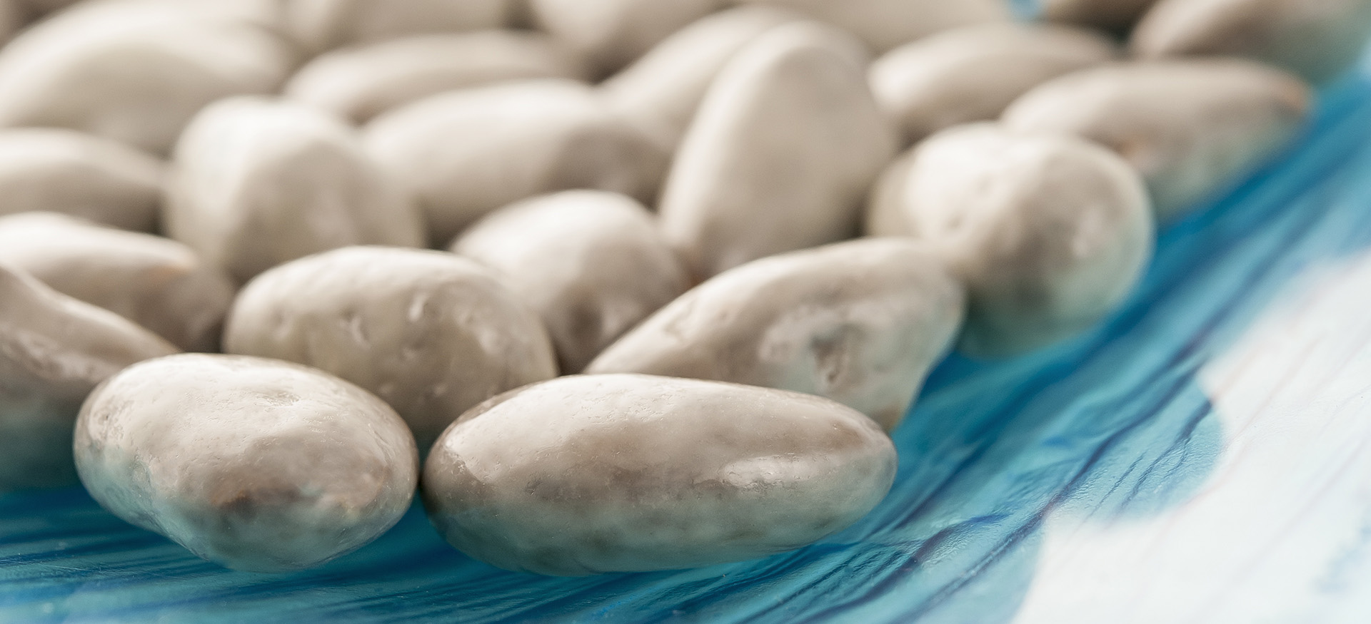 Fragments de chocolats et d'amandes enrobées de nougatine dont l'aspect nous rappelle les plages de Nice.