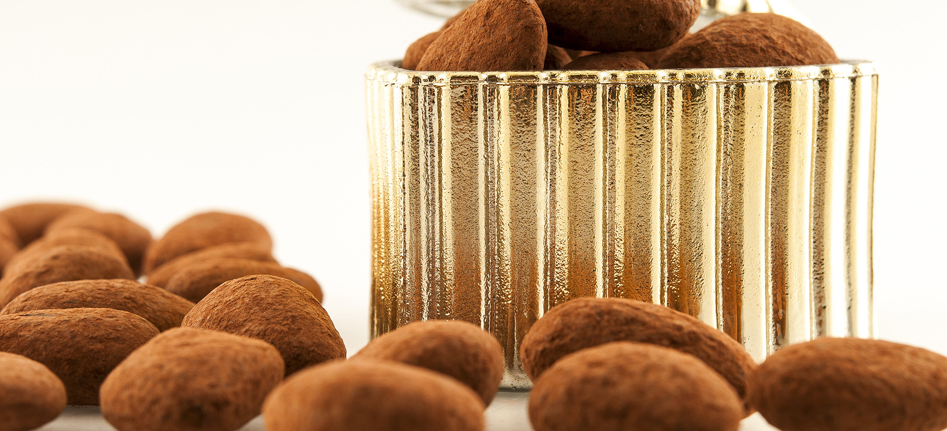 Création originale du sud de la France, Amandes de Provence enrobées légèrement de nougatine puis d’une couverture de chocolat noir, légèrement amer et poudré de cacao