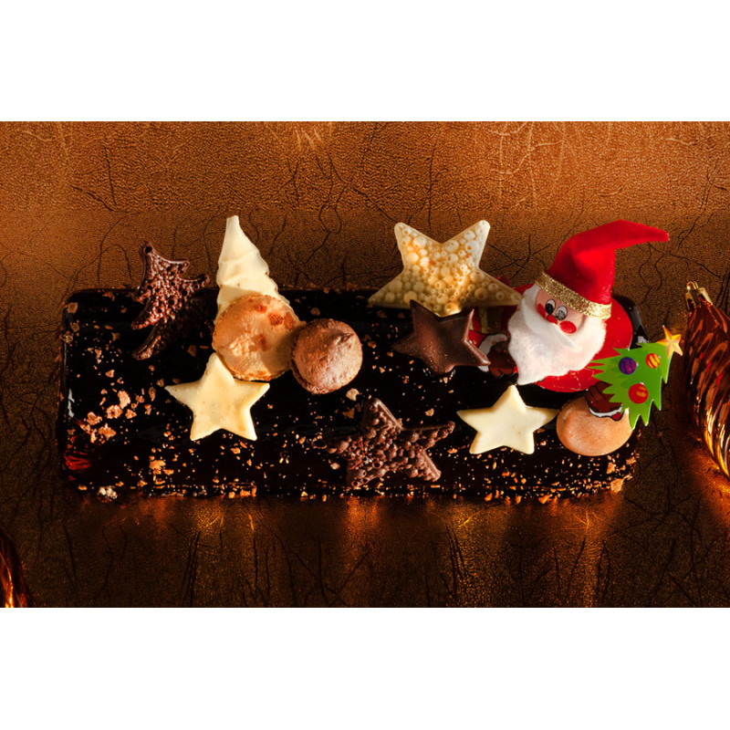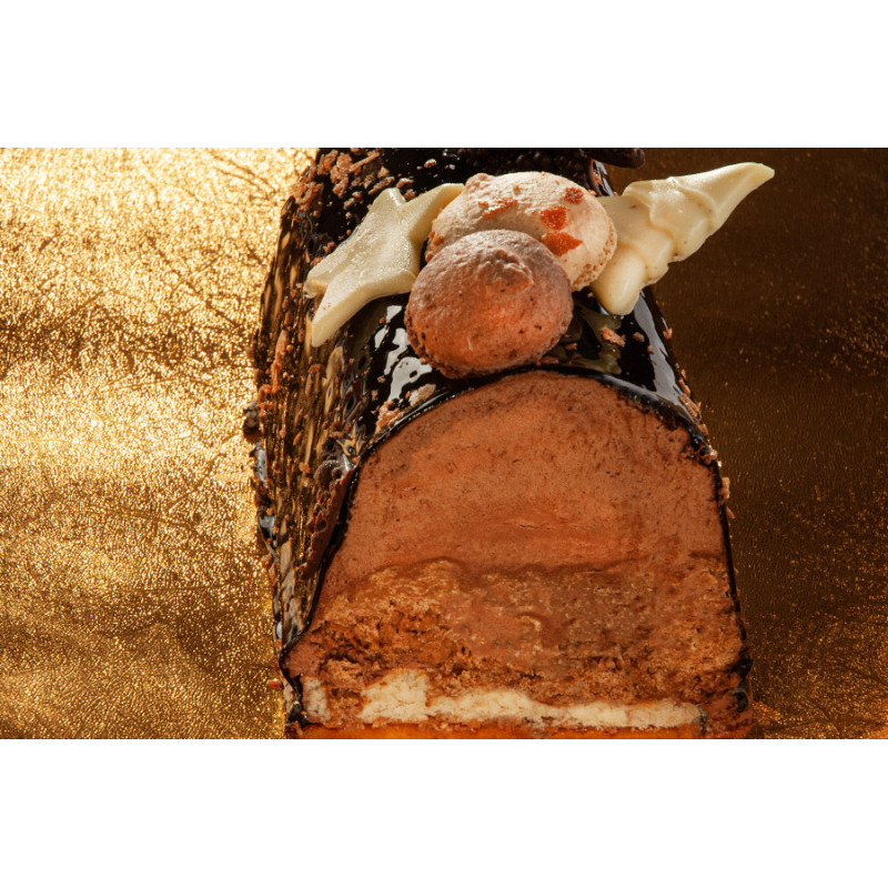 Bûche de Noël alliant onctuosité et croquant avec son crémeux chocolat et son croustillant praliné, le tout dressé sur un délicieux biscuit aux amandes, pour un surplus de gourmandise