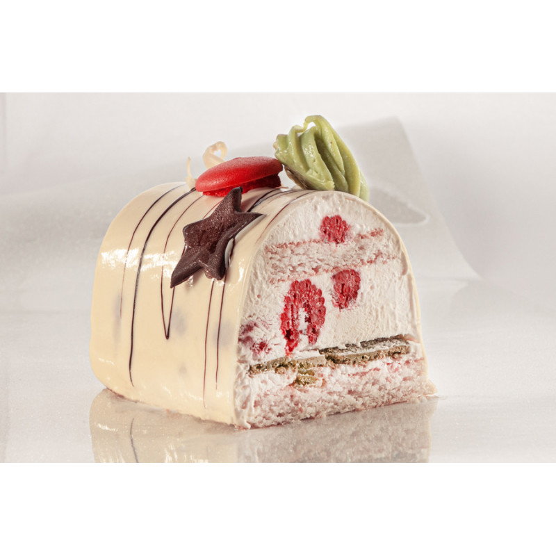 Amandes, œufs, farine, sucre, chocolat blanc, crème liquide, pistache, framboises, feuilletine, praliné (fruits à coques)Allergènes : fruits à coques, gluten, oeufs, lait, beurre