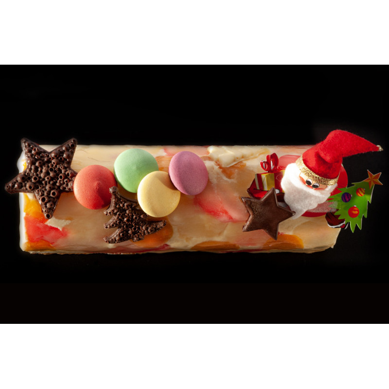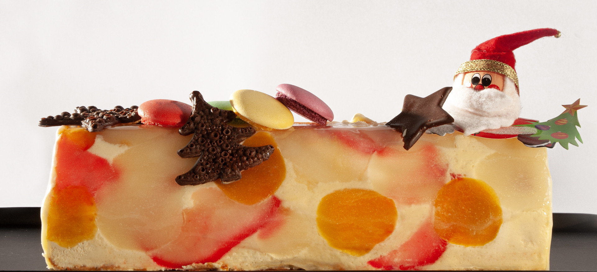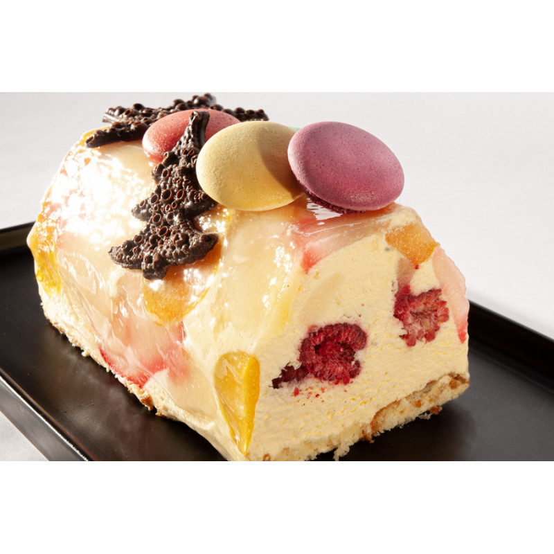 Un dessert tout en douceur avec la bûche aux fruits pour terminer le repas sur une touche de légèreté toute méritée apportée par son cocktail de fruits coloré et sa crème vanillée