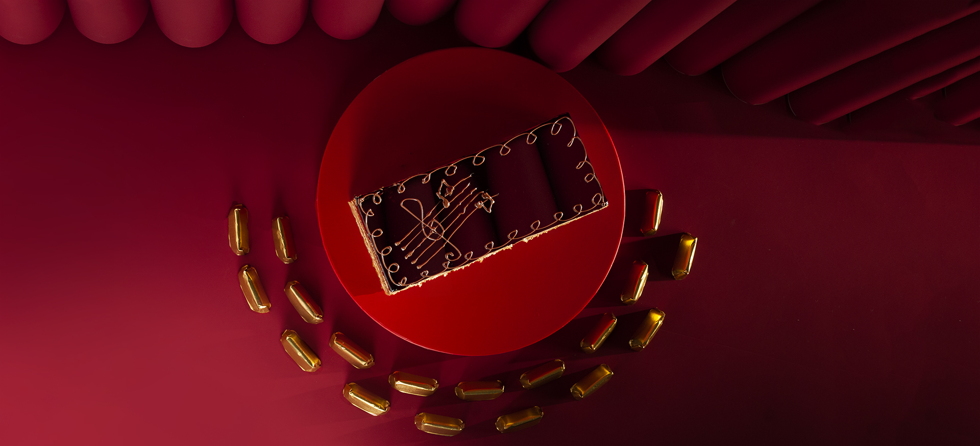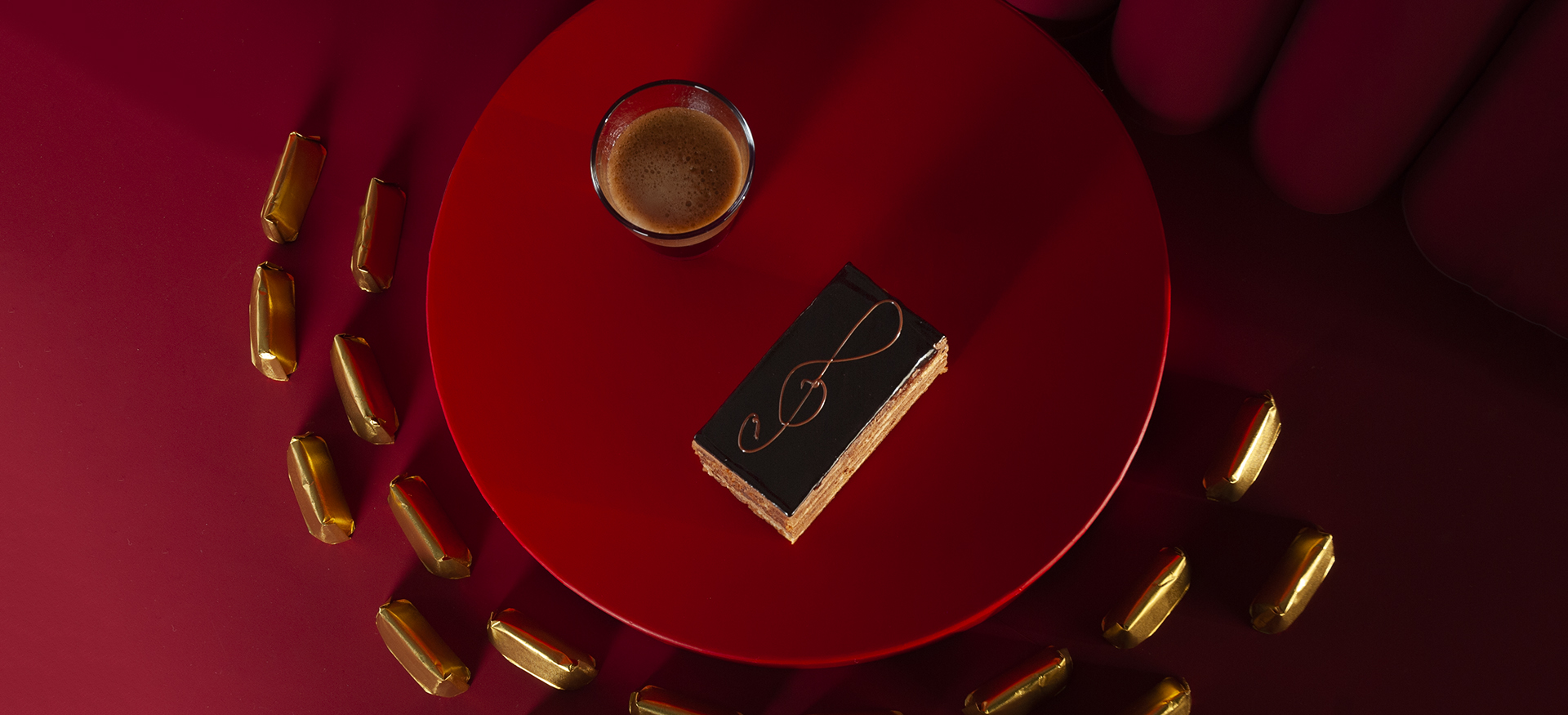 Biscuit aux amandes au chocolat parfumé au café.Allergènes : fruits à coques, gluten, œufs, lait, beurre.Le décor des gâteaux est susceptible d'être modifié à tout moment.